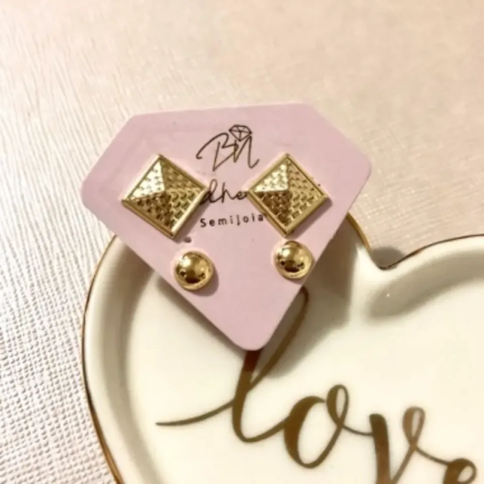 Brinco Duplo Pirâmide e Meia Bolinha Lisa Banhado a Ouro 18k